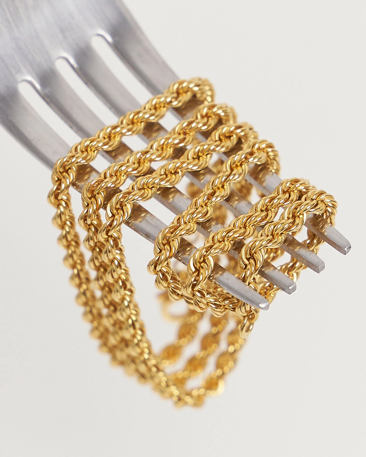 The Cord Bracelet, inspired by ancient Egyptian artisanship, features a rope-like design of intertwined gold links that mirrors ancient Egyptian and nautical ropes. This structure enhances its strength and minimizes the risk of kinking or breaking.