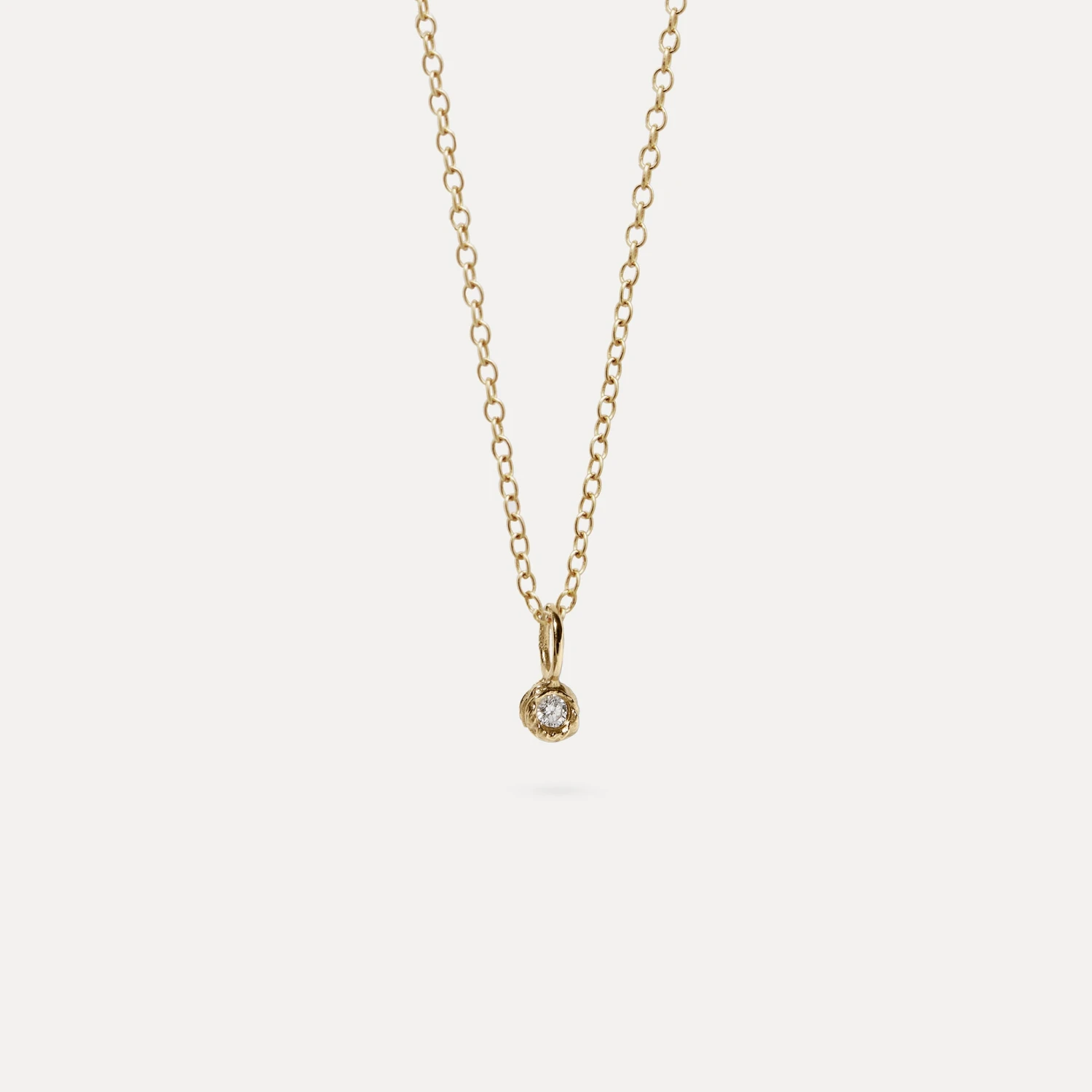 The Mater Diamond Necklace is our nature-oriented take to on a point of light necklace design. With an organically shaped, imperfect nest framing our fairly sourced diamond, you can’t go wrong. The Mater Diamond necklace is exclusively available in 14K recycled solid gold.