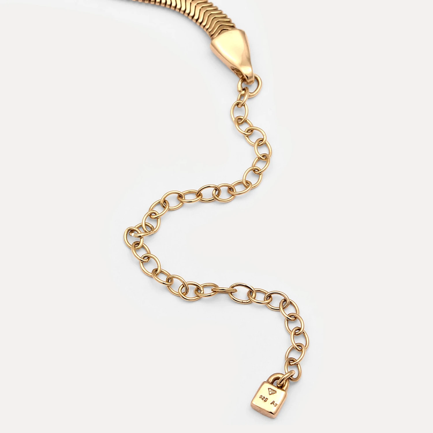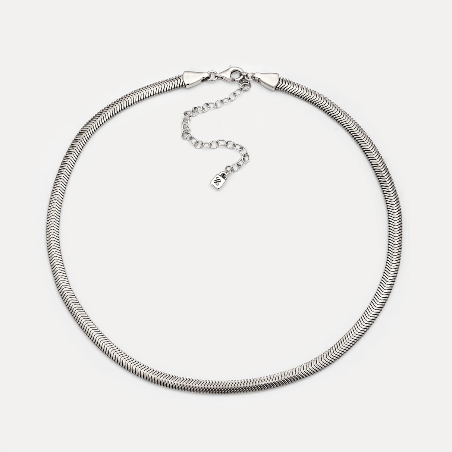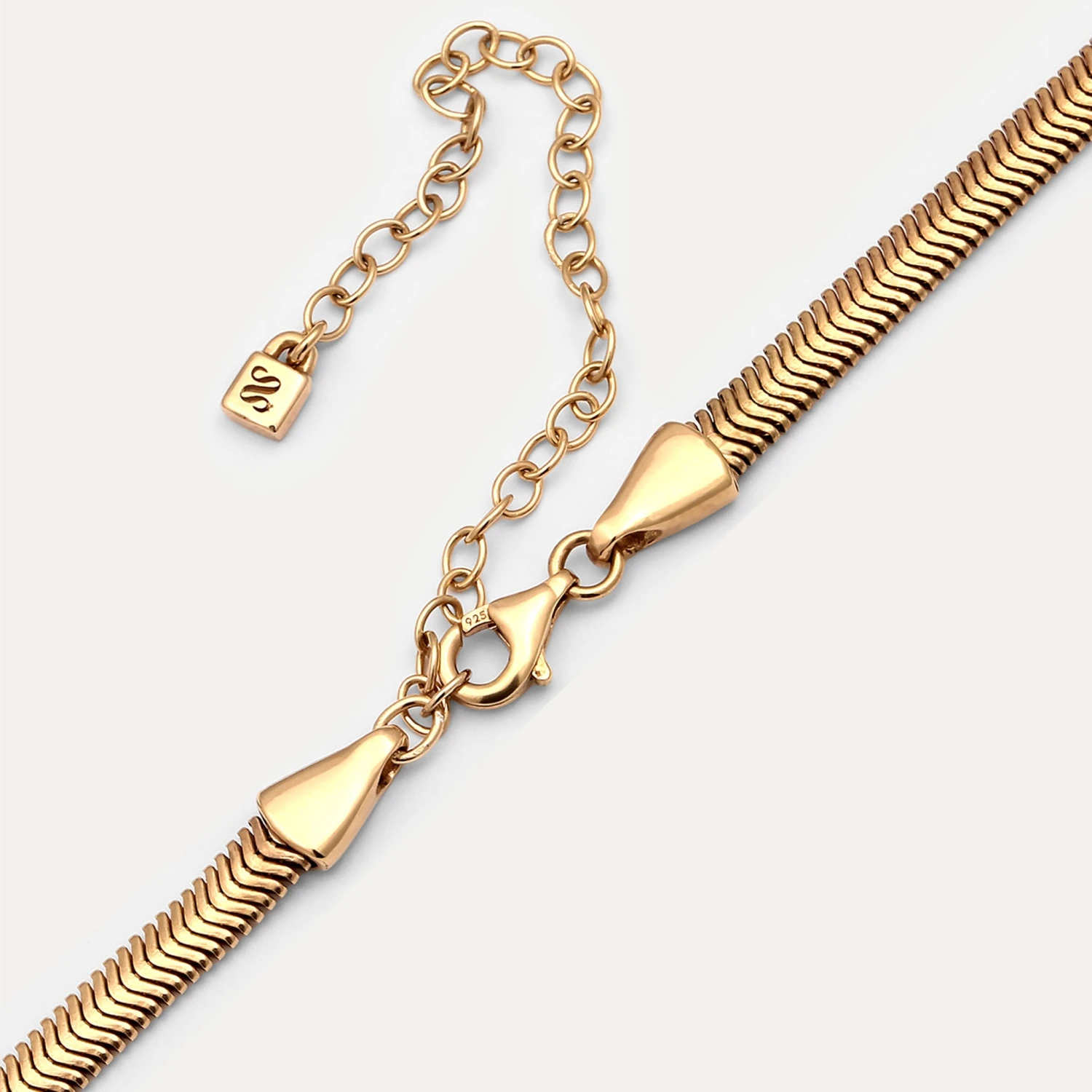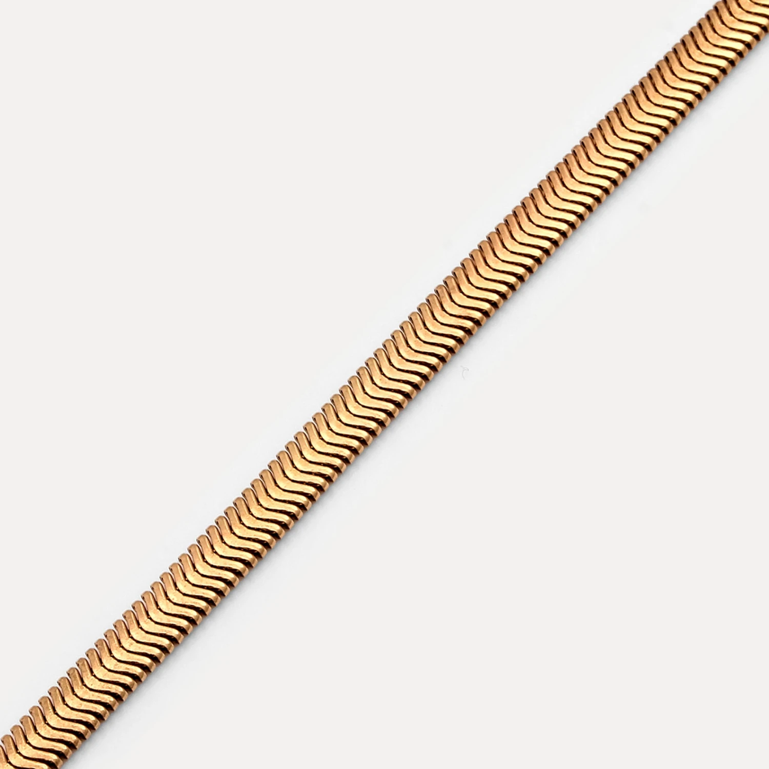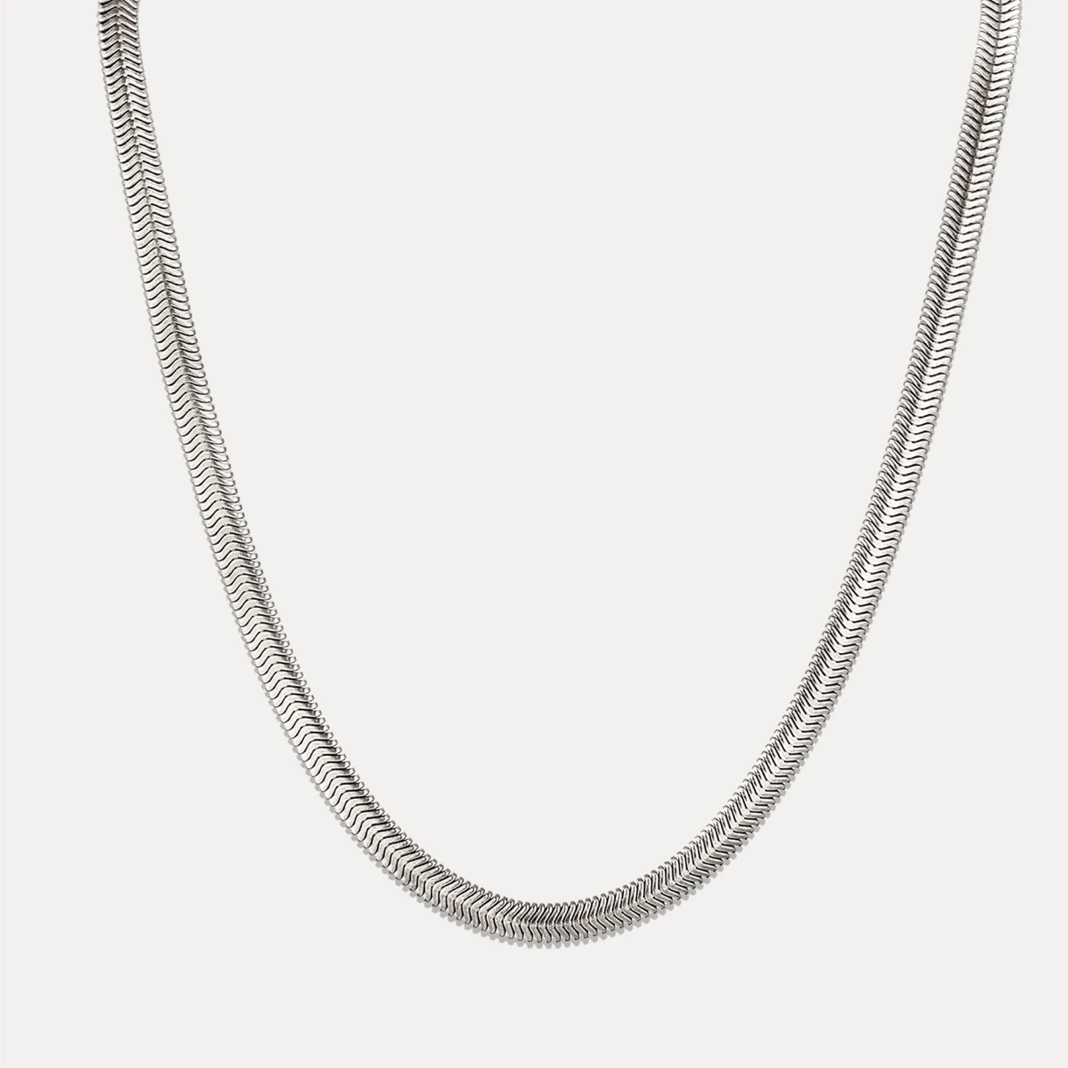 Flat slanted links curve into a tight herringbone pattern, mimicking the fishbone texture of the herring. Designed with a lobster clasp for secure wear and easy layering.