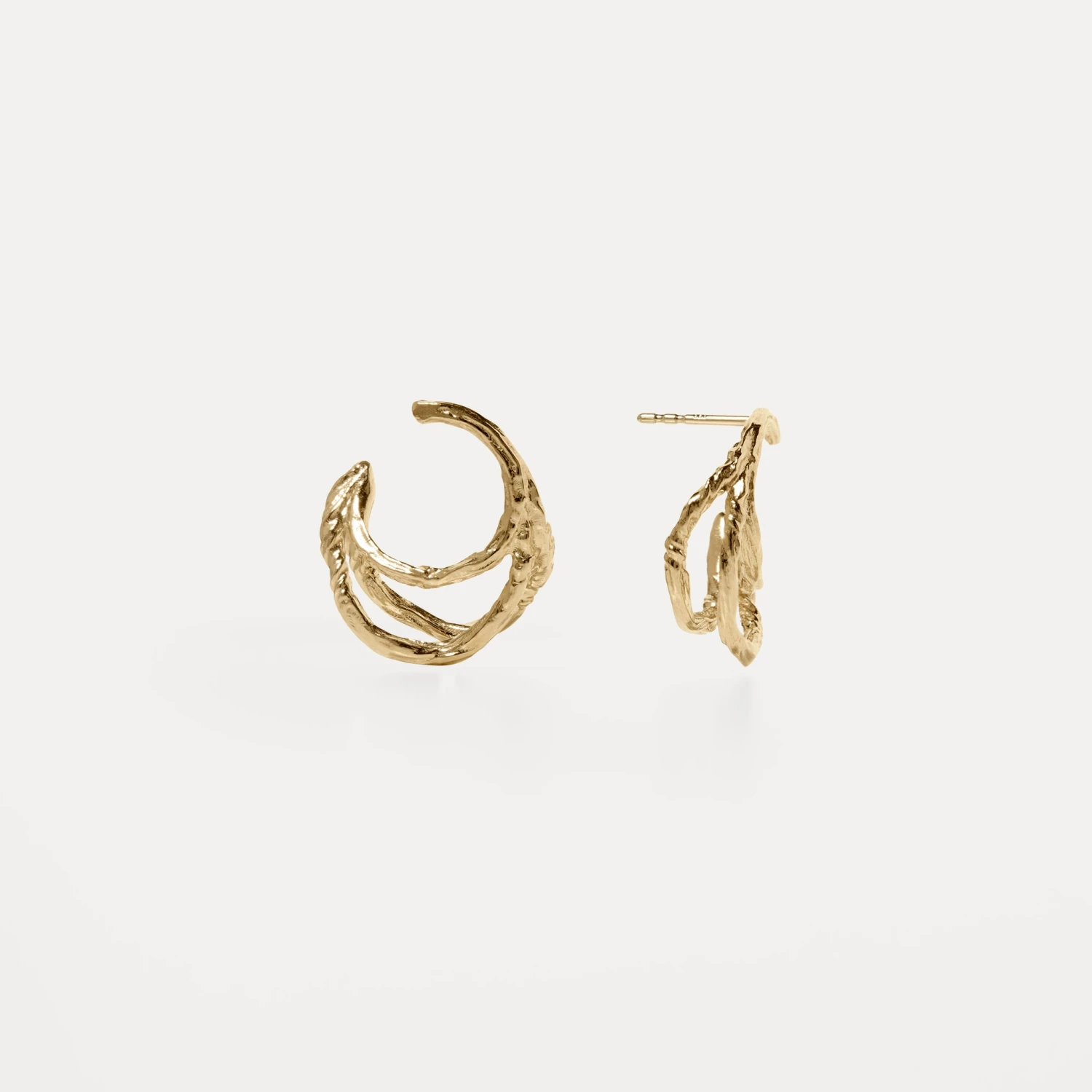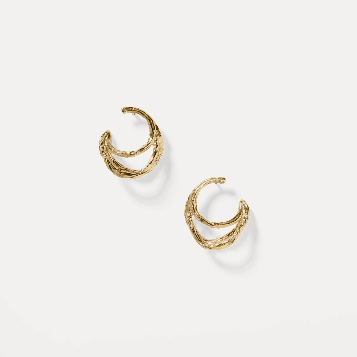 Roots that intertwine to form an intricate and eye-catching set of hoop earrings. The Mater Embrace Hoop Earrings are that little extra flair you were looking for. This design is crafted using recycled 14K solid gold and made to order with a clear purpose in mind.
