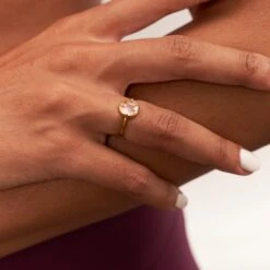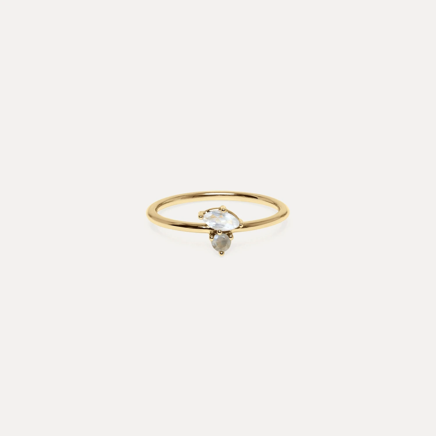 The Joy Solitaire Ring features a unique floating design. The floating stone is attached to the main one, creating a unique and unseen structure. It is designed with fairly sourced Moonstone and Gray Moonstone stones.