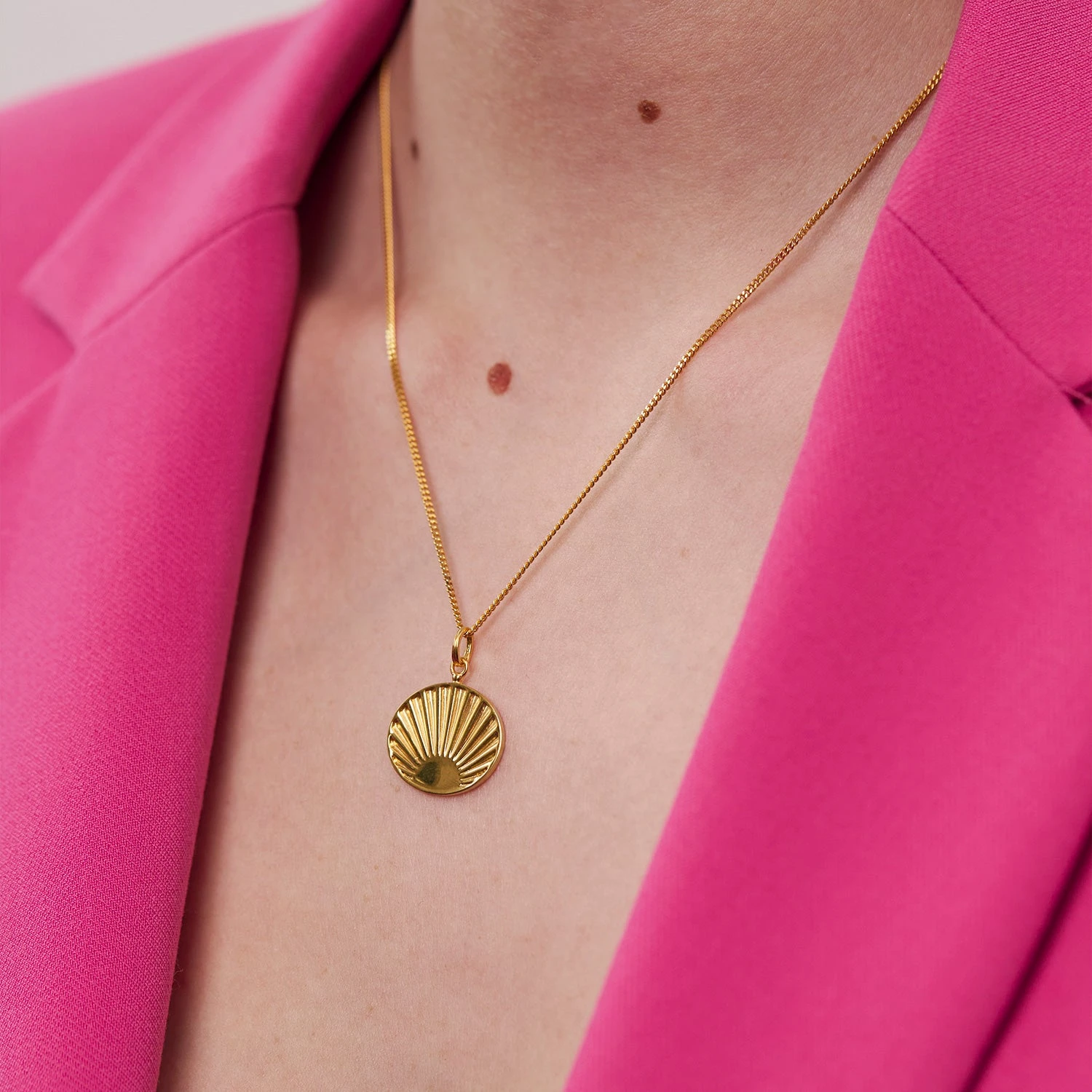 Verlasse deine Muschel und fange die Sonnenstrahlen mit deiner Solar Kette/deinem Solar Anhänger ein. Mit dem Aufgang der Sonne brechen neue Tage zum Feiern an. Erhältlich in recyceltem 24K Gold Vermeil und Sterlingsilber.