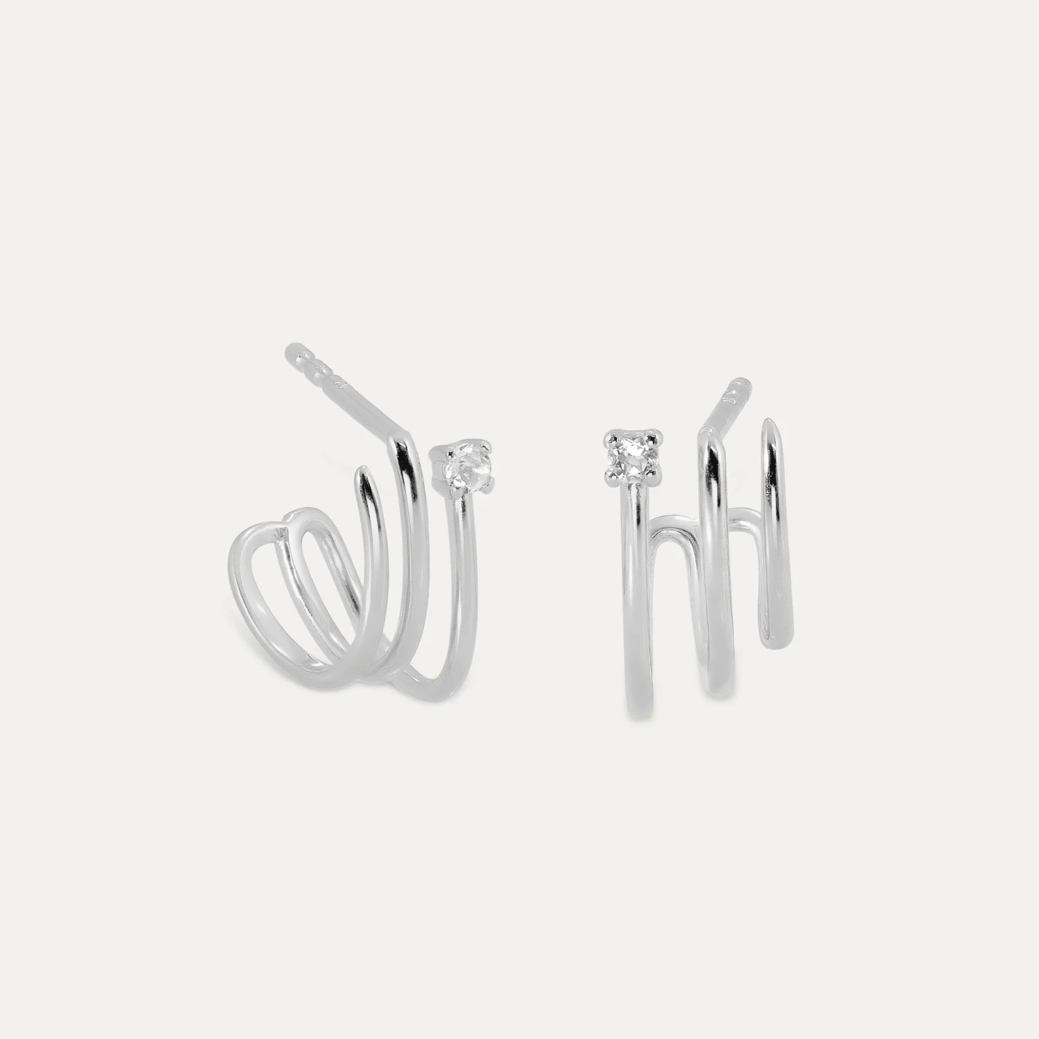 The Trine Huggies feature a unique hugging structure with three metal wire hoops that simultaneously embrace your ear, adorned with a delicate gemstone. This design creates an optical illusion, making it look like you’re wearing three separate earrings when it’s actually just one. Made with a fairly sourced White Sapphire stone.
